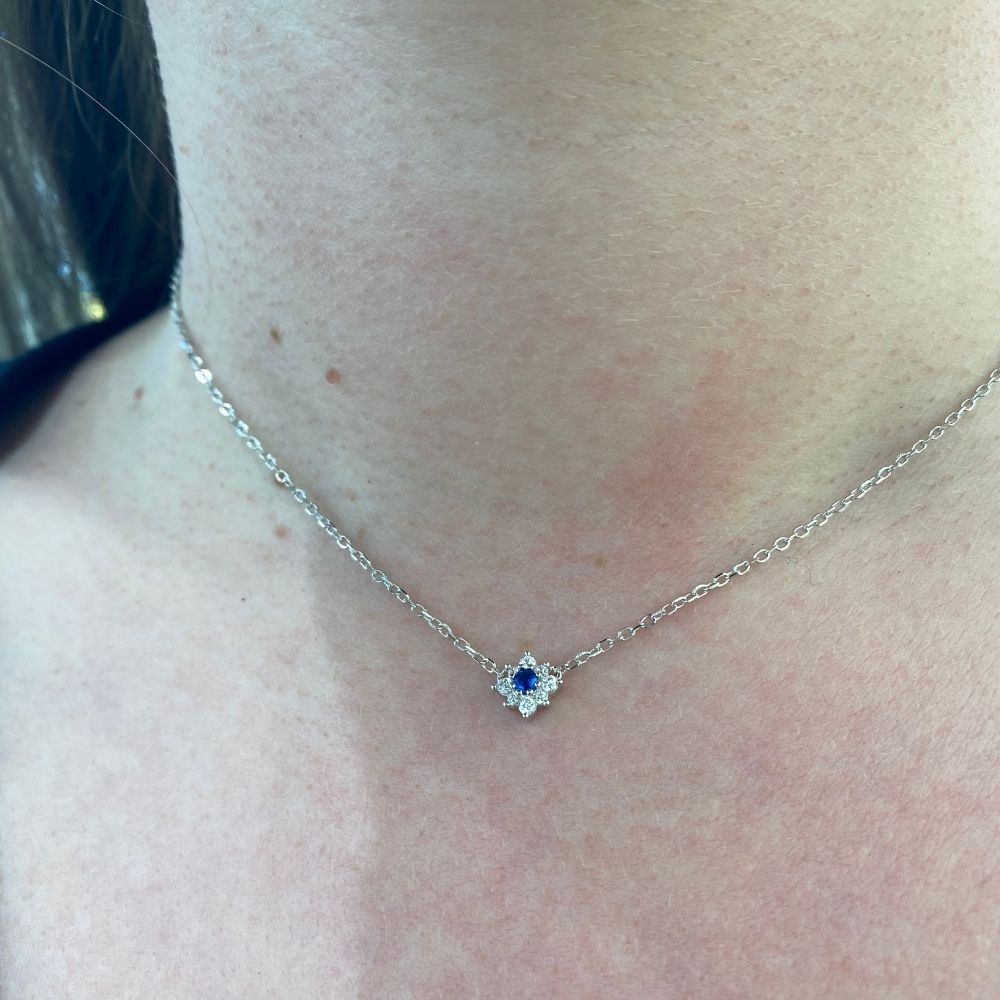 Subtil et élégant, ce collier en argent 925 est composé d’un oxyde de zirconium central de taille ronde et d’un bleu somptueux rendant le bijou éclatant. Sa pierre centrale est entourée de 8 oxydes de zirconium incolores formant un joli motif style étoile.