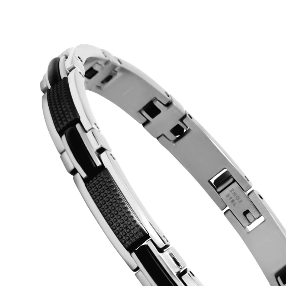 Le bracelet Rochet Magnum pour homme incarne l’élégance moderne grâce à son design bicolore noir et argenté en acier inoxydable de haute qualité. Rehaussé d’un insert en silicone noir, il allie robustesse et style contemporain. Avec une largeur de 7 mm et une longueur ajustable de 22 cm, il s’adapte parfaitement à votre poignet pour un confort optimal. Polyvalent et raffiné, ce bracelet est un accessoire indispensable pour compléter votre look avec distinction.
