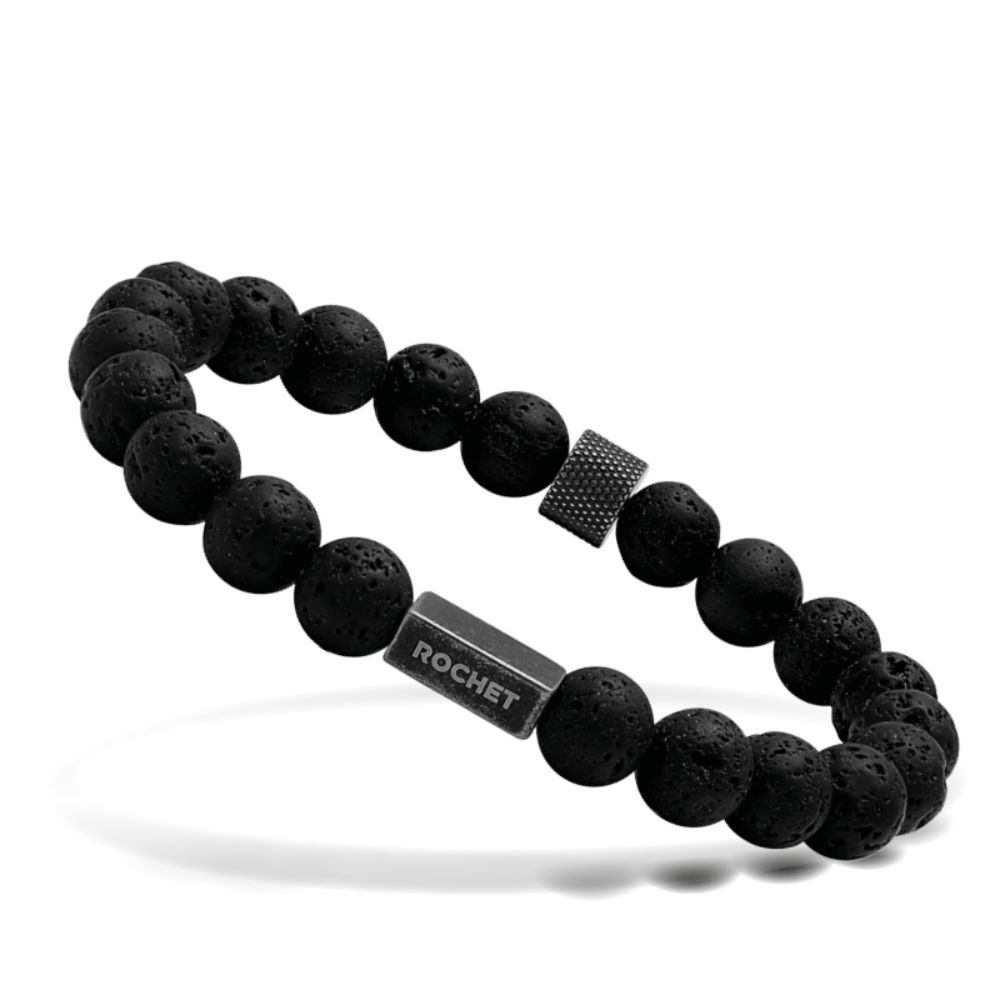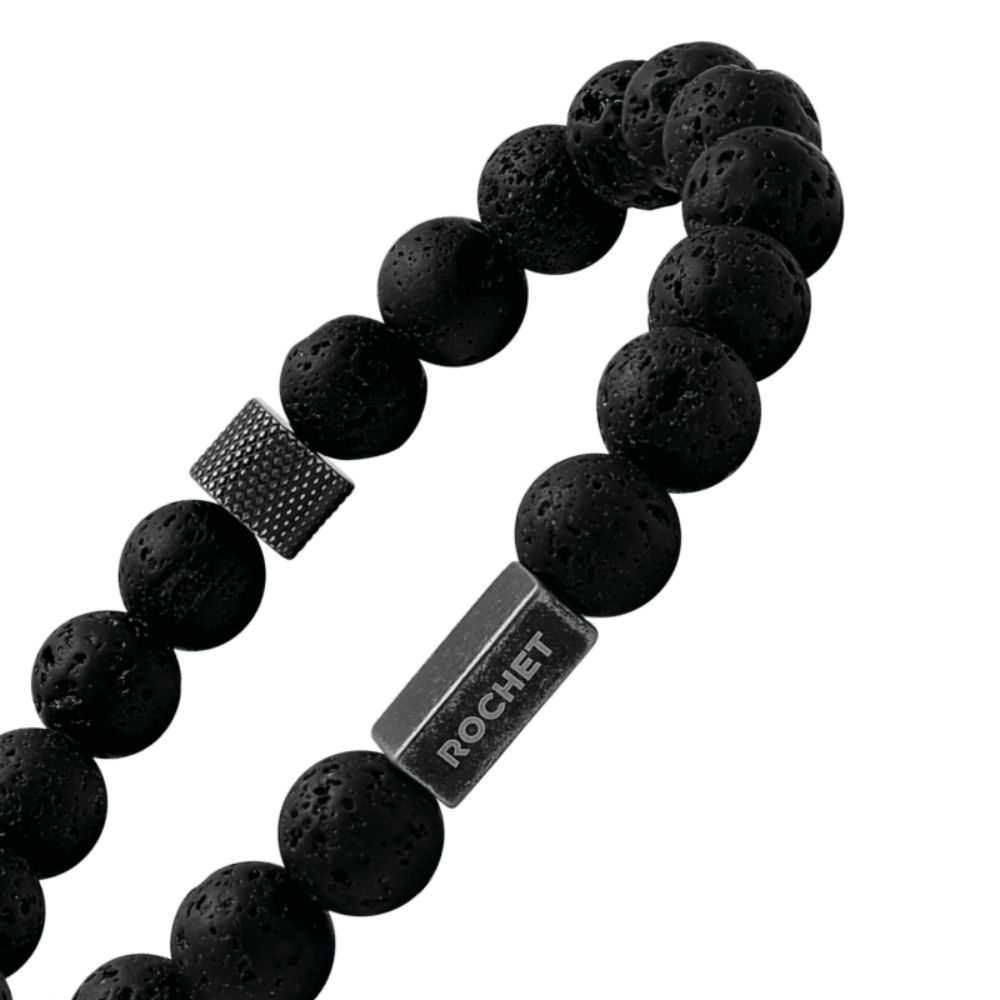 Bracelet homme Rochet Zen en perles de lave noire de 8mm de diamètre et acier vieilli pour élégance et énergie. Un design contemporain évoquant la résilience et la paix intérieure.
