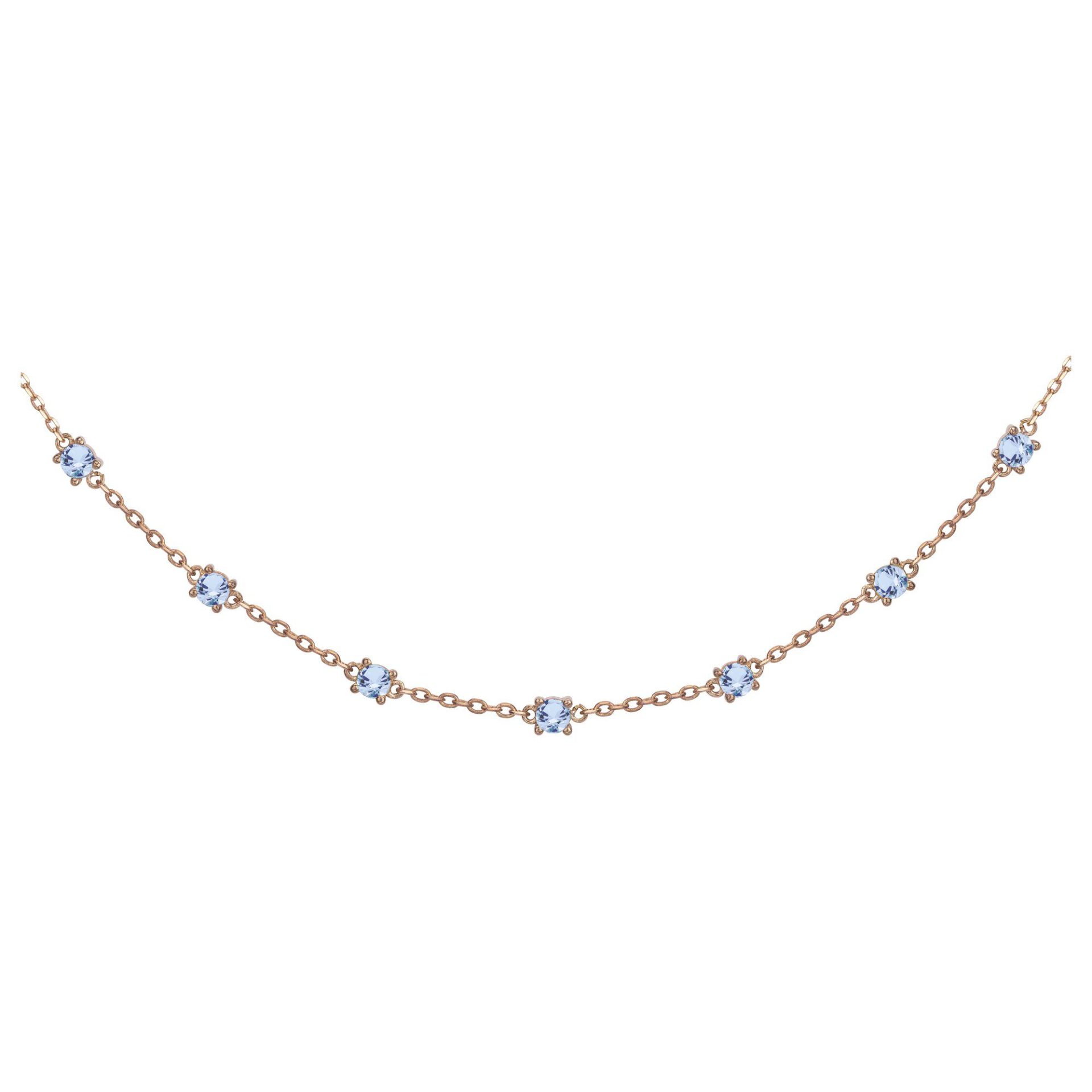 Découvrez ce charmant collier en plaqué or rose et serti d’oxydes de zirconium bleus. Alternant pierres et métal, ce collier fantaisie viendra habiller votre cou avec raffinement. Il mesure 38cm au plus court et 43cm au plus long. Un fermoir mousqueton servira de fermeture sécurisé.