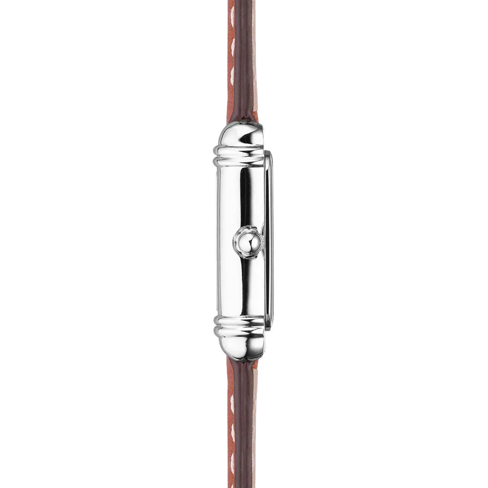 Le boîtier présente une forme tonneau de 17,8 x 19,4 mm, idéale pour un poignet féminin. Il est réalisé en acier poli brillant, ce qui lui confère un éclat élégant. Par conséquent, la montre affiche une silhouette fine et harmonieuse.