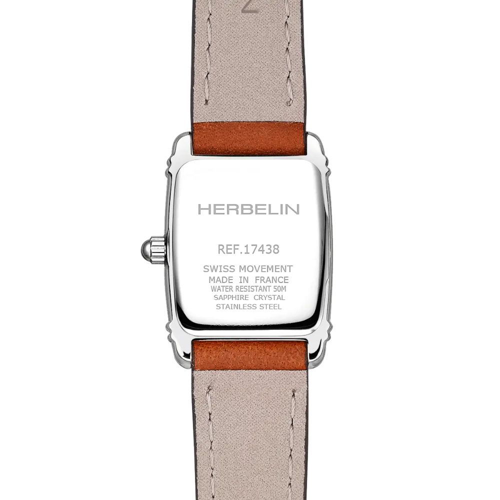 Le bracelet est confectionné en cuir de couleur camel, apportant une touche chaleureuse et élégante. Les surpiqûres blanches renforcent son style raffiné. Enfin, la boucle ardillon siglée Herbelin assure un maintien sûr et confortable.