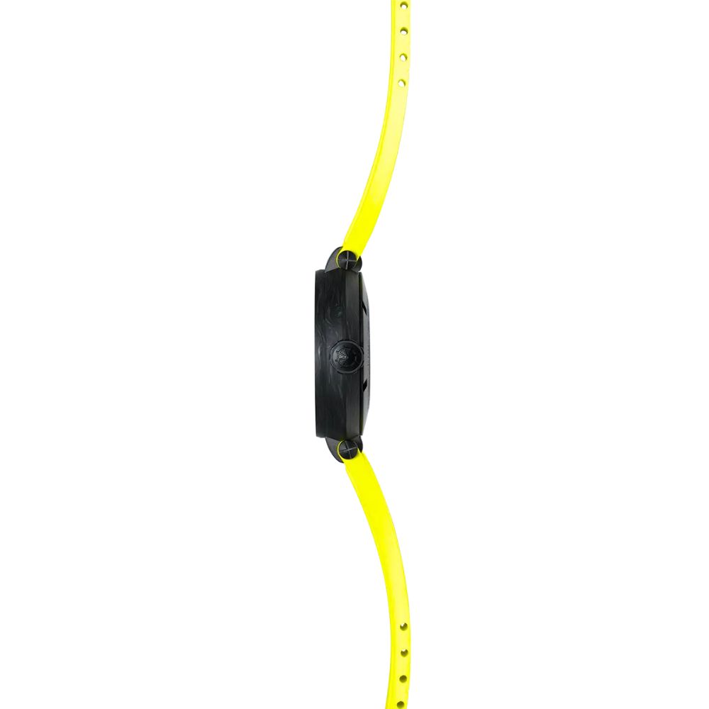 Son boîtier de 43 mm en carbone et titane, combiné à un traitement DLC noir, offre une robustesse remarquable tout en étant extrêmement léger, idéal pour une utilisation quotidienne ou sportive. Le cadran noir texturé, orné de détails inspirés de la course, accueille deux aiguilles et des index noirs luminescents, accompagnés d’une trotteuse jaune vif qui apporte une touche dynamique et sportive.