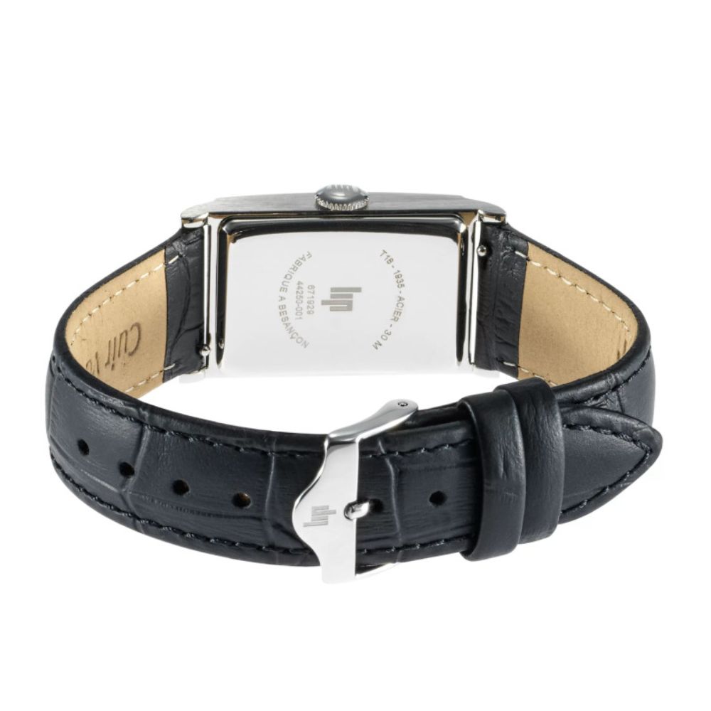 Le boîtier rectangulaire en acier inoxydable, aux dimensions harmonieuses de 21,2 x 38,5 mm, alterne finitions polies et brossées pour un rendu chic et discret. Le cadran argenté à finition soleillée est habillé de chiffres romains noirs classiques, tandis que les deux aiguilles et la petite seconde bleues apportent une touche de caractère subtile.