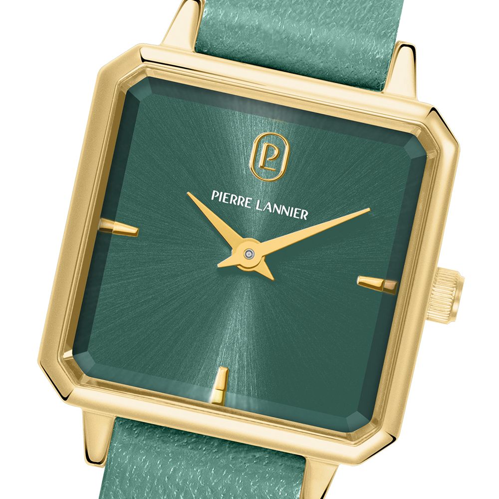 Le cadran vert soleillé capte la lumière avec subtilité. Les deux aiguilles dorées assurent une lecture épurée. Les trois index doré jaune structurent le cadran avec élégance. Le logo Pierre Lannier à 12 h signe le modèle.