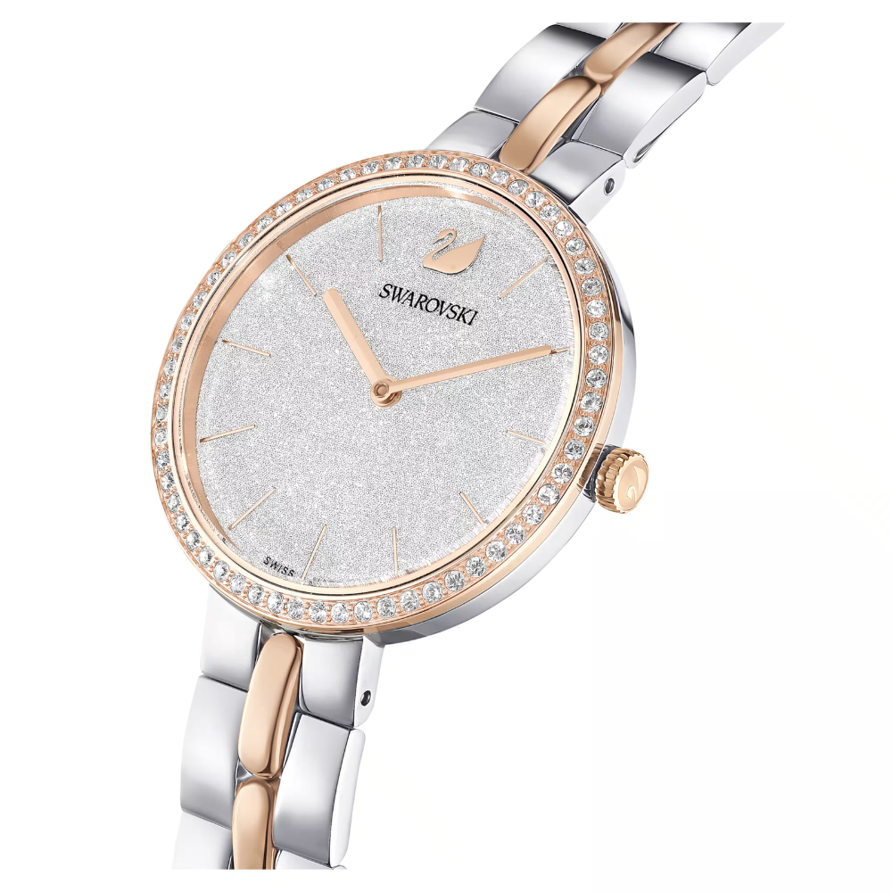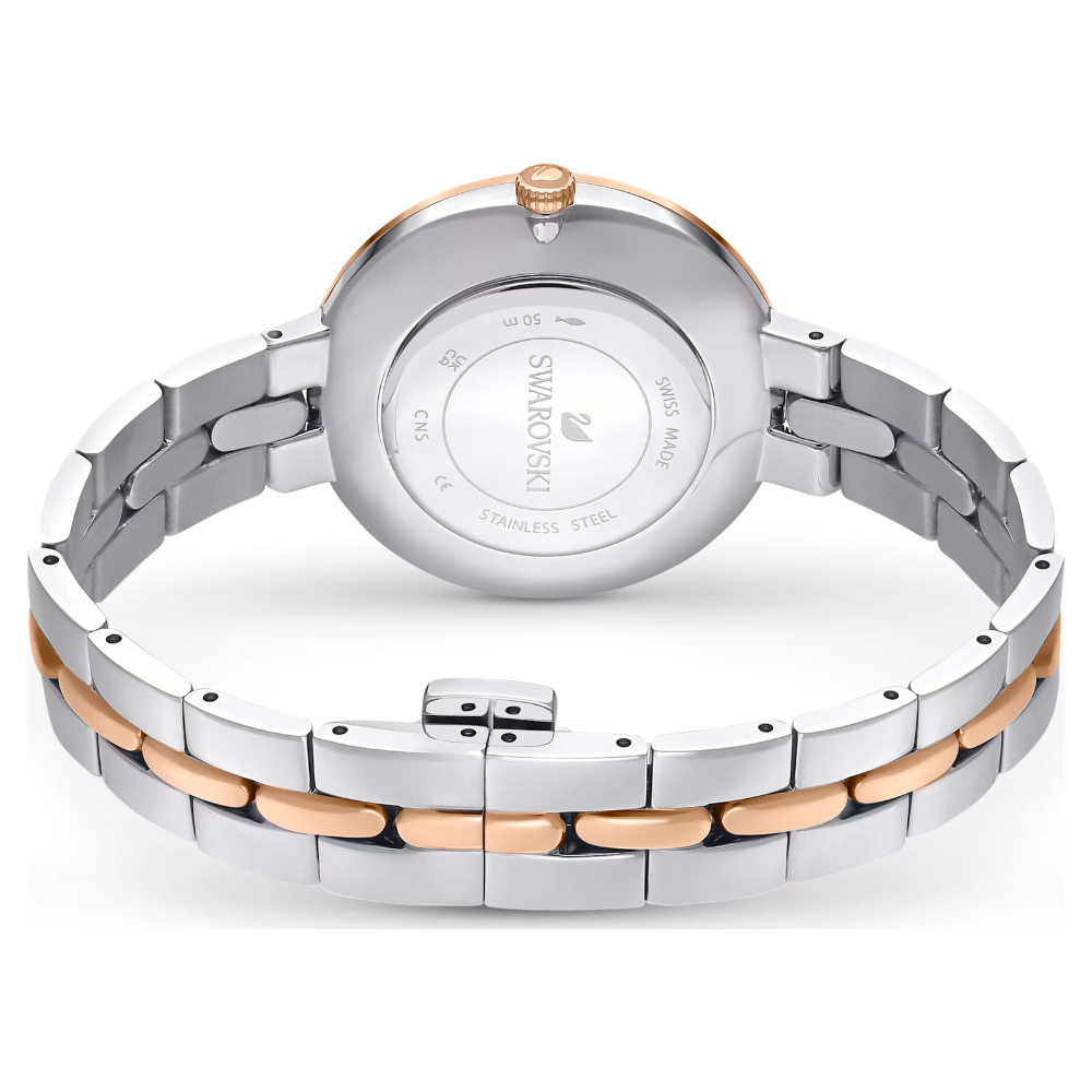 La lunette pavée de cristaux blancs incarne l’ADN Swarovski et illumine la pièce, tandis que le bracelet bicolore en acier argenté et PVD rose, avec ses maillons centraux teintés de rose, signe un jeu de contraste élégant et raffiné. La montre abrite un mouvement à quartz suisse reconnu pour sa fiabilité, et se ferme grâce à un fermoir papillon à boutons poussoirs garantissant confort et sécurité.